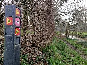 Bij nat weer zijn de laarzenpaden erg drassig. Ook sommige onverharde paden kunnen drassig zijn.In de wandelroutes 1614 en 1617 loopt het traject ook langs aluminium gekleurde wandelknooppunten van wandelnetwerk Venray. Het wandelknooppuntnummer staat hier bovenop!In wandelroute 1617 zit in het traject na wandelknooppunt 77 een passage waarbij U het water via stapstenen moet oversteken. Een bever heeft hier momenteel een beverburcht van gemaakt! Wilt U geen natte voeten, loop dan van 77 naar 45.
